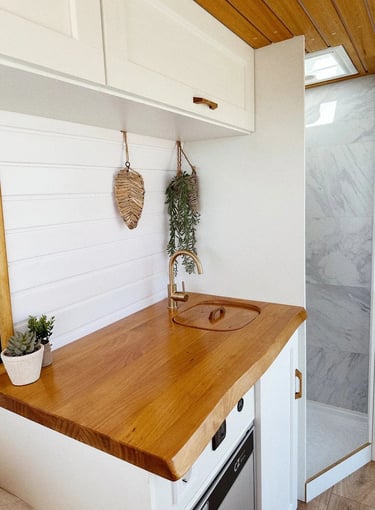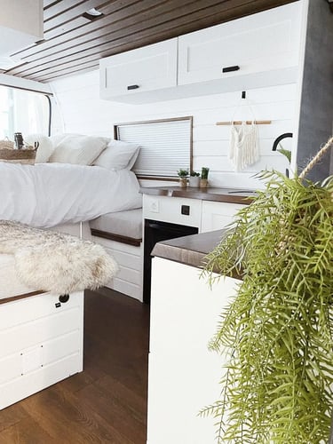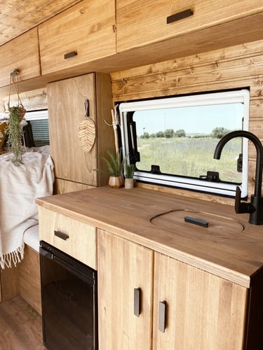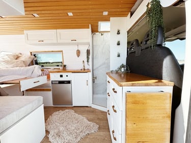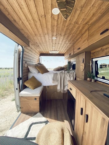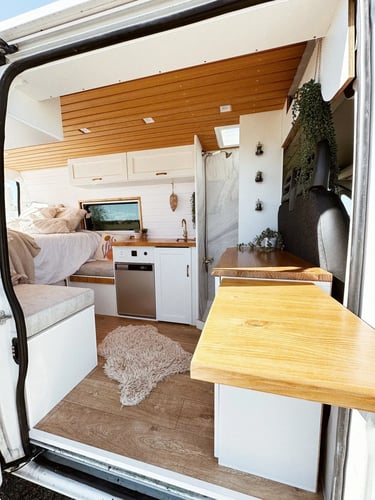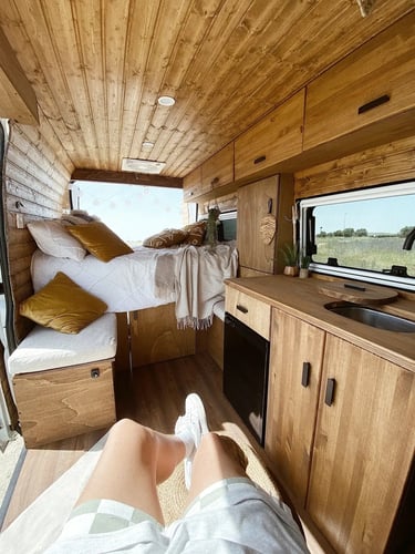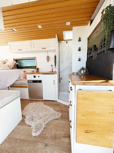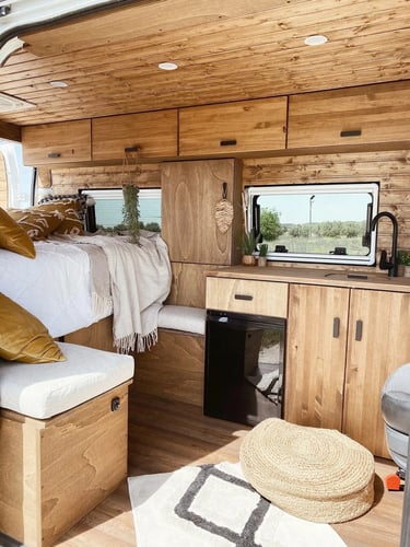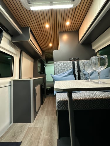 Una camper con carácter, donde los tonos oscuros se combinan con madera natural para crear un ambiente cálido, elegante y muy acogedor.